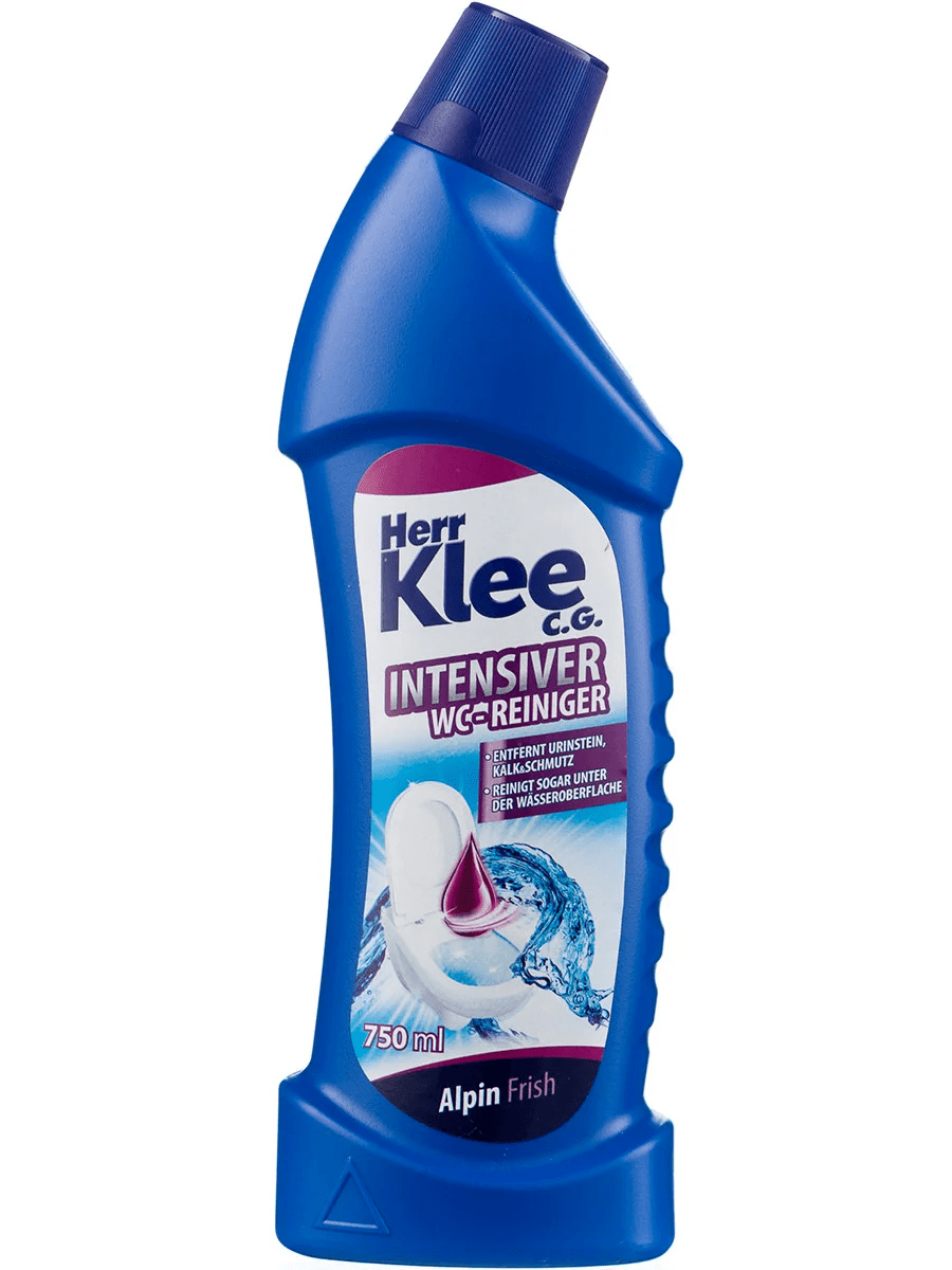 Гель Herr Klee C.G. intensive WC Reiniger ( Альпийская свежесть)– высококачественный гель, разработанный специально для чистки туалета. Эффективно удаляет ржавчину, известковые отложения и прочие загрязнения. Позволяет дольше сохранять чистоту и свежесть унитаза. Средство для очистки унитаза с мощной формулой и гелевой концентрированной консистенцией эффективно удаляет известковые образования и камень, обеспечивает гигиеническую чистоту, блеск и великолепный аромат на продолжительное время. Благодаря инновационной концентрированной формуле, средство для унитаза Herr Klee лучше проникает в обрабатываемую поверхность, тем самым предотвращая последующее появление бактерий после обработки. Активные компоненты, входящие в состав геля Herr Klee, успешно очищают загрязнения даже в труднодоступных местах, удаляют известковый и мочевой камень, и туалет дольше остается чистым и ароматным.
