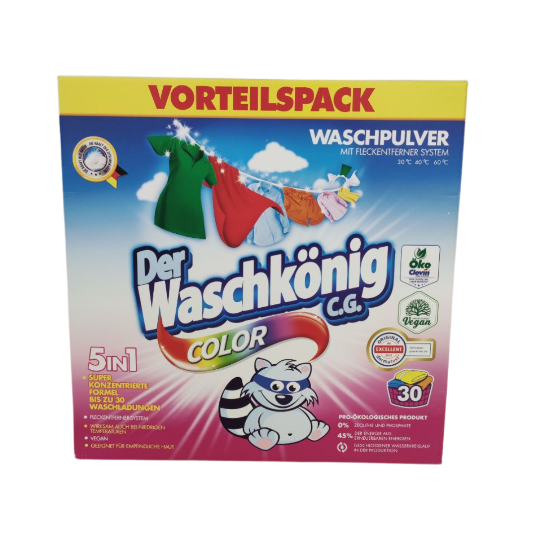 Порошок не только эффективно удаляет пятна, но и гарантирует, что ткани сохраняют свой первоначальный, интенсивный цвет. Продукт имеет приятный аромат и хорошо растворяется в воде, содержит много красных гранул, не вызывает аллергии и не раздражает кожу. Он не содержит фосфатов и цеолитов (компонентов, которые отвечают за аллергию). Der Waschkönig C. G. Colour содержит в своем рецепте средство для удаления накипи, и именно поэтому нет необходимости использовать дополнительные средства. Диапазон температур стирки: от 30°C до 60°C.
